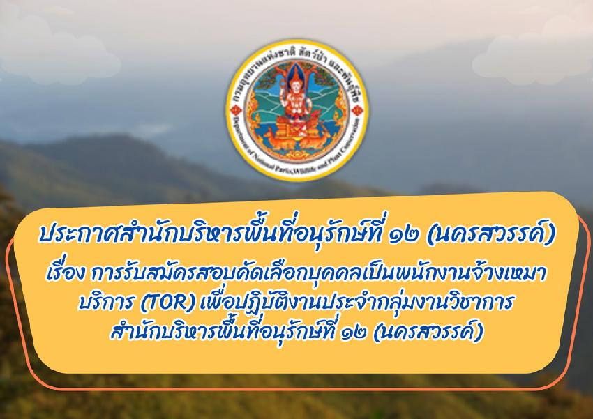 ประกาศสำนักบริหารพื้นที่อนุรักษ์ที่ ๑๒ (นครสวรรค์) เรื่อง การรับสมัครสอบคัดเลือกบุคคลเป็นพนักงานจ้างเหมาบริการ (TOR) เพื่อปฏิบัติงานประจำกลุ่มงานวิชาการ สำนักบริหารพื้นที่อนุรักษ์ที่ ๑๒ (นครสวรรค์)