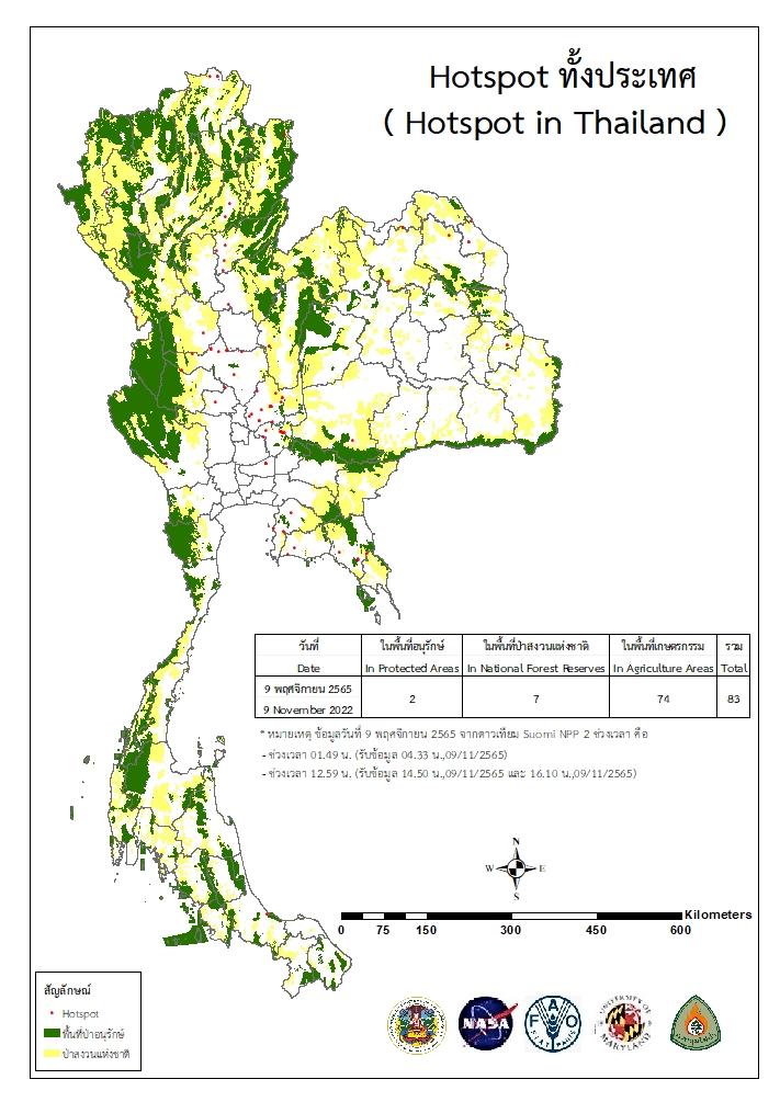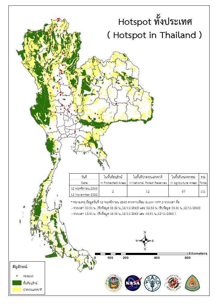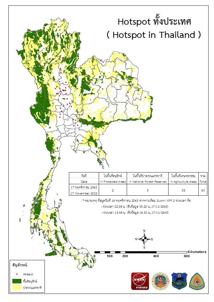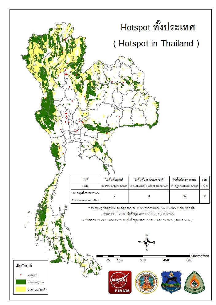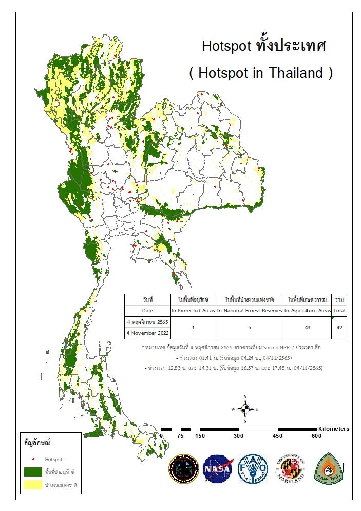 แผนที่แสดงจุดที่ดาวเทียมตรวจพบความร้อนซึ่งมีโอกาสเป็นบริเวณที่เกิดไฟไหม้ (Hotspot)
