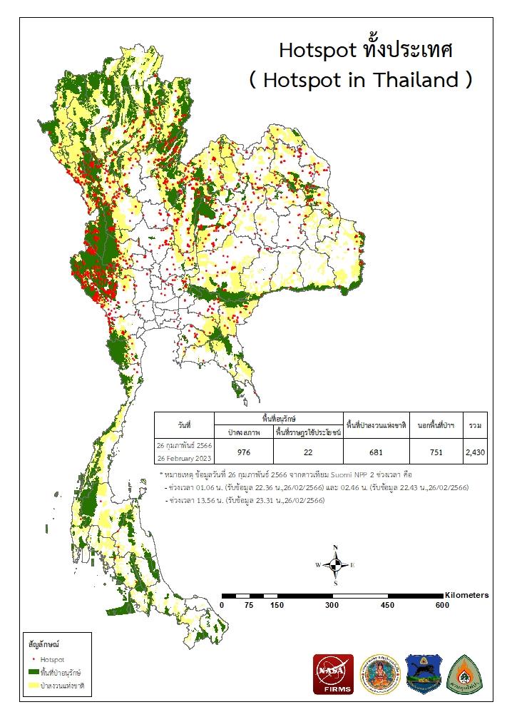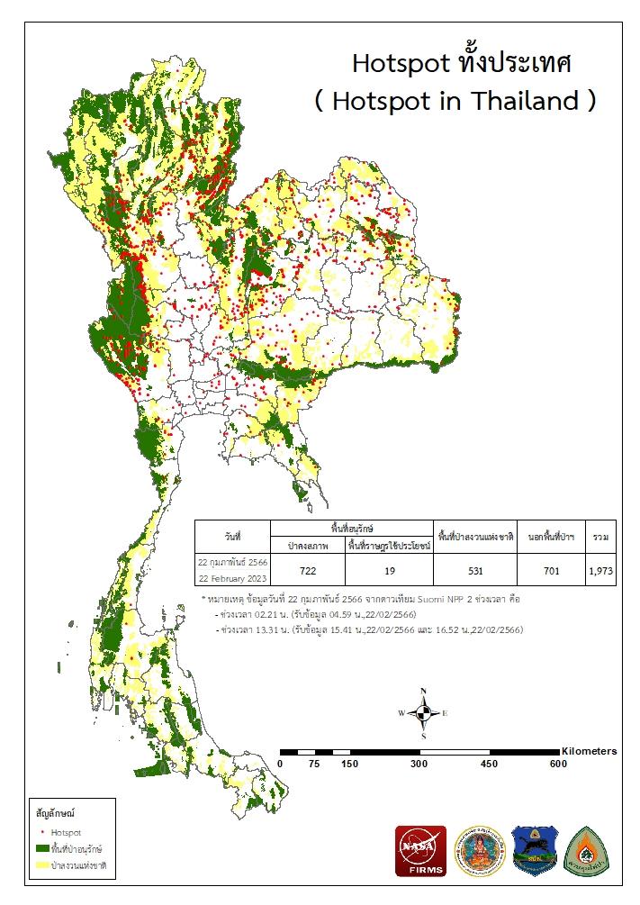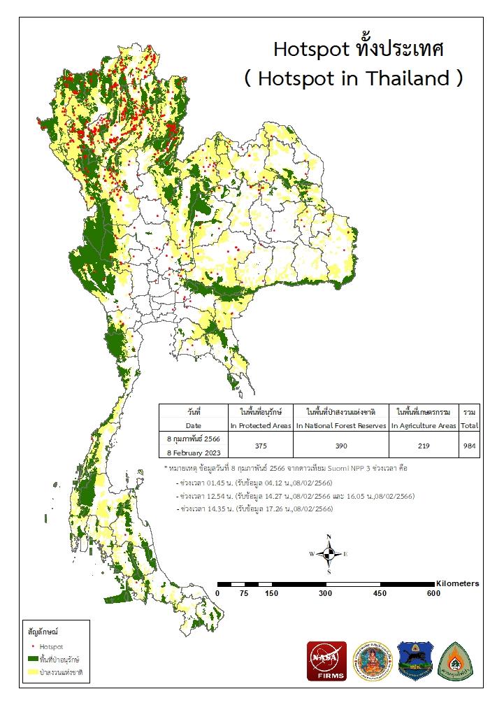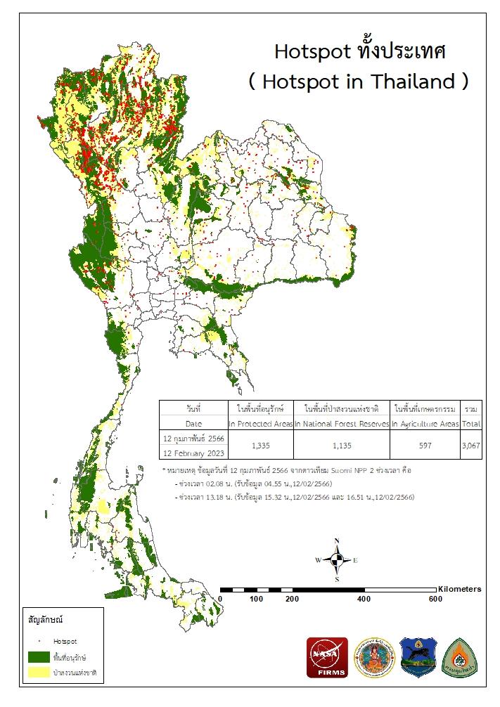 แผนที่แสดงจุดที่ดาวเทียมตรวจพบความร้อนซึ่งมีโอกาสเป็นบริเวณที่เกิดไฟไหม้ (Hotspot)