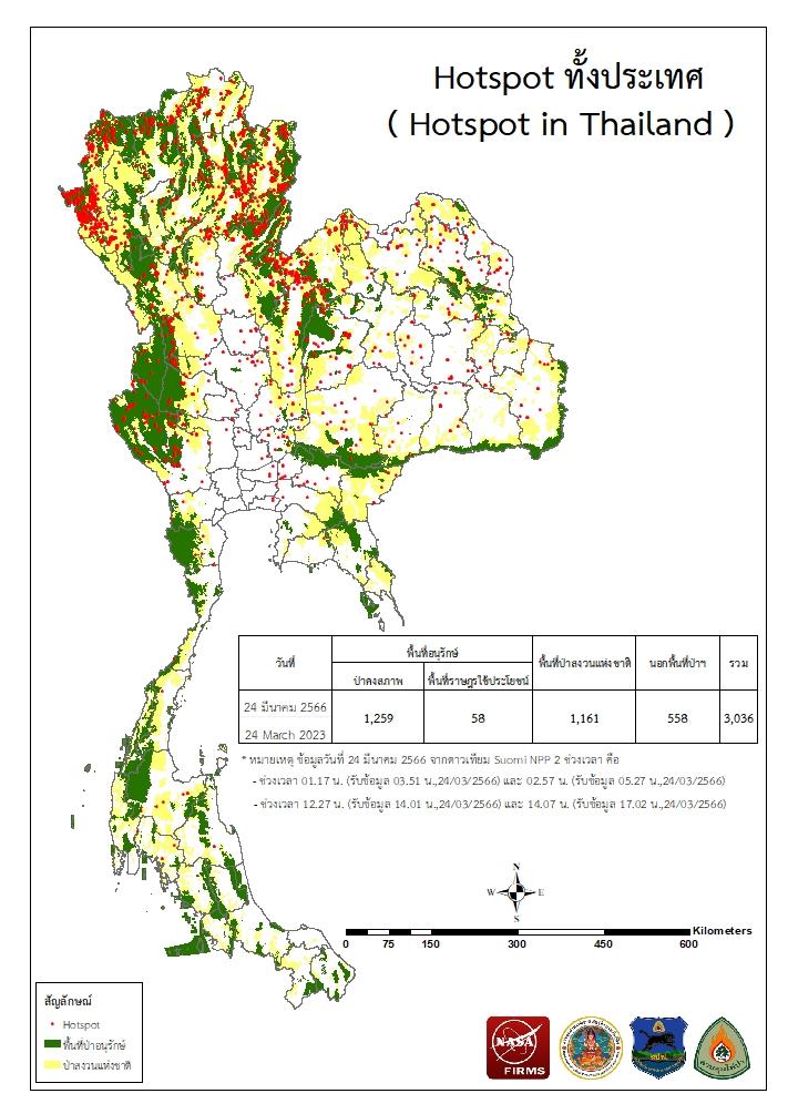 แผนที่แสดงจุดที่ดาวเทียมตรวจพบความร้อนซึ่งมีโอกาสเป็นบริเวณที่เกิดไฟไหม้ (Hotspot)