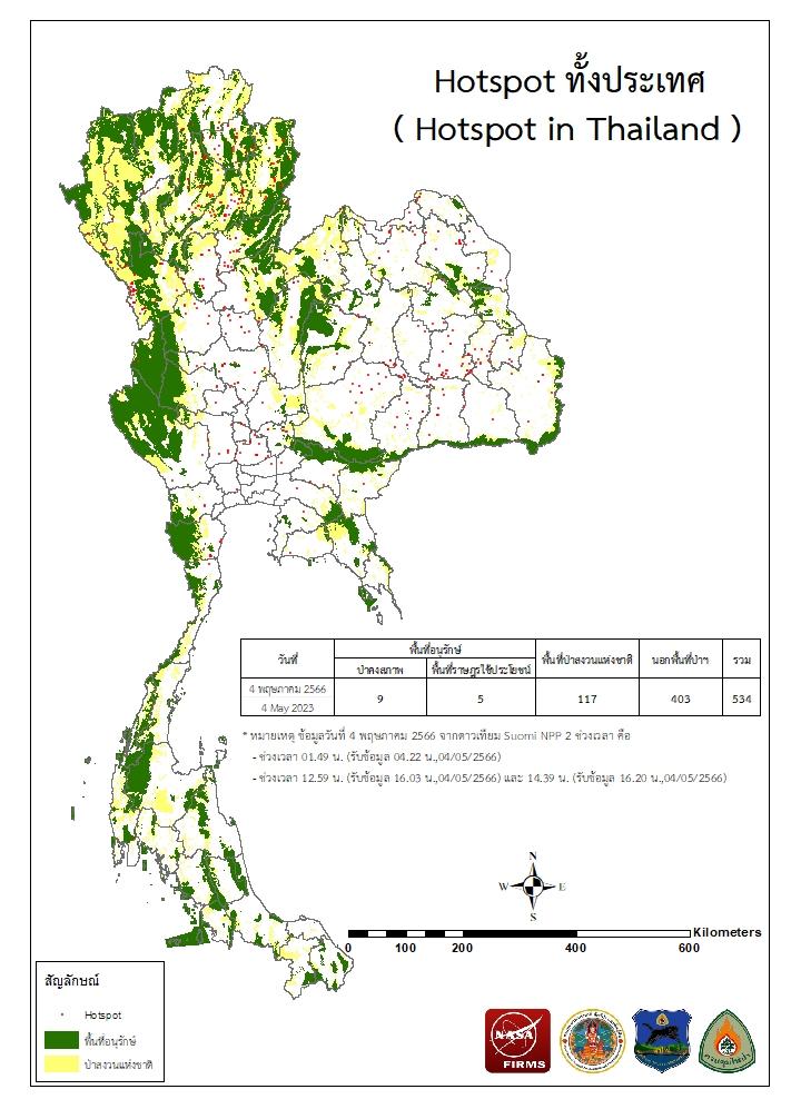 แผนที่แสดงจุดที่ดาวเทียมตรวจพบความร้อนซึ่งมีโอกาสเป็นบริเวณที่เกิดไฟไหม้ (Hotspot)