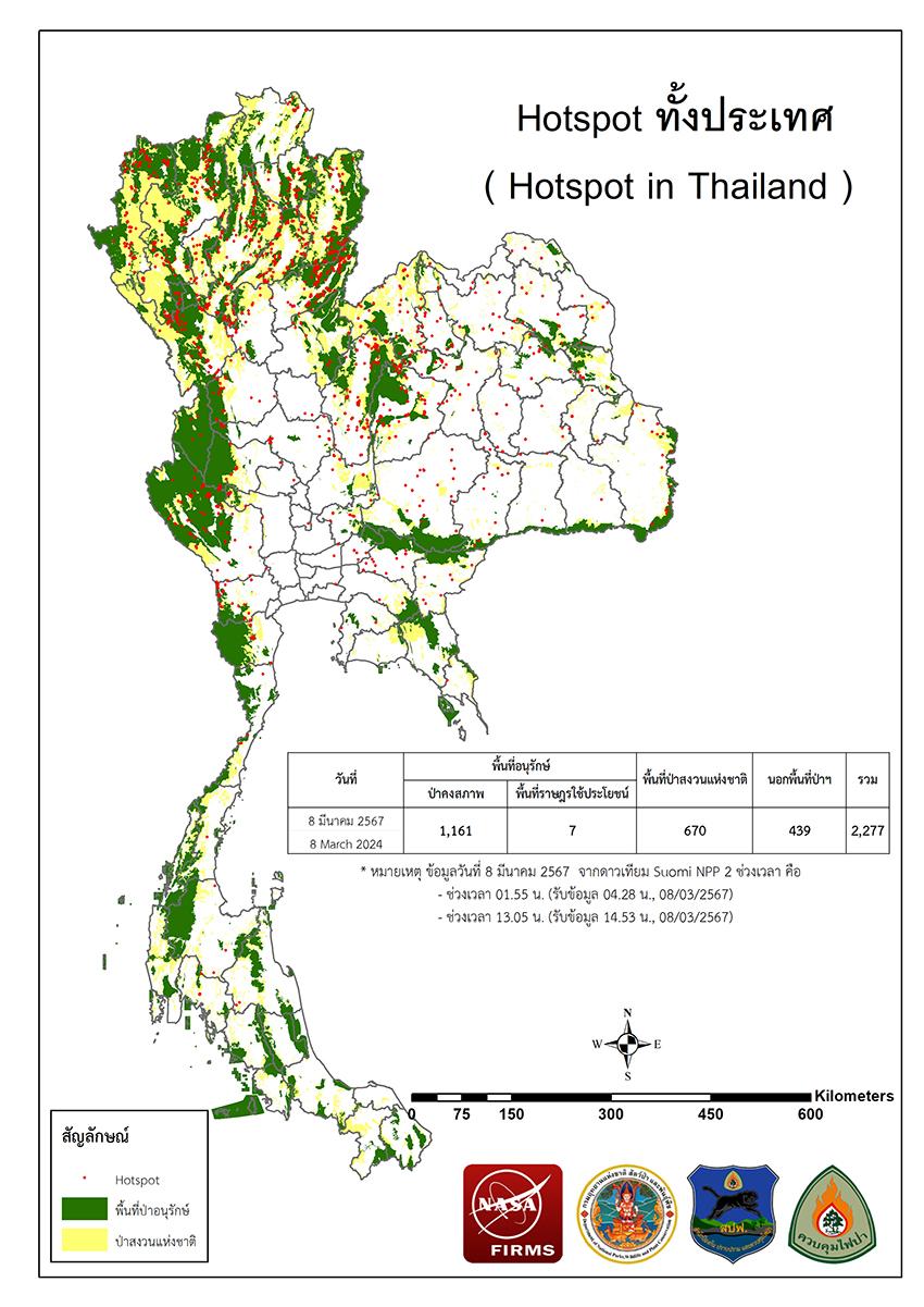 แผนที่แสดงจุดที่ดาวเทียมตรวจพบความร้อนซึ่งมีโอกาสเป็นบริเวณที่เกิดไฟไหม้ (Hotspot)