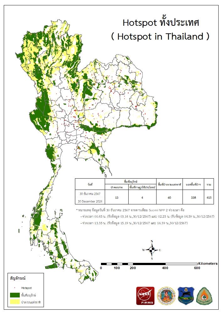 แผนที่แสดงจุดที่ดาวเทียมตรวจพบความร้อนซึ่งมีโอกาสเป็นบริเวณที่เกิดไฟไหม้ (Hotspot)