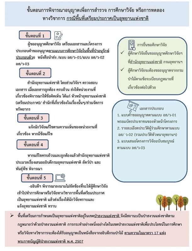 ขั้นตอนการขออนุญาตเข้าทำการสำรวจ การศึกษาวิจัย หรือการทดลองทางวิชาการ ในพื้นที่เตรียมการประกาศเป็นอุทยานแห่งชาติ