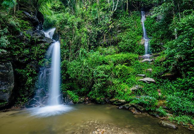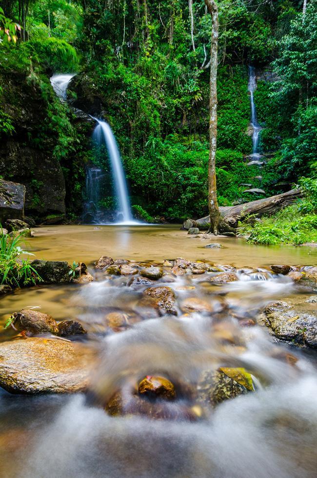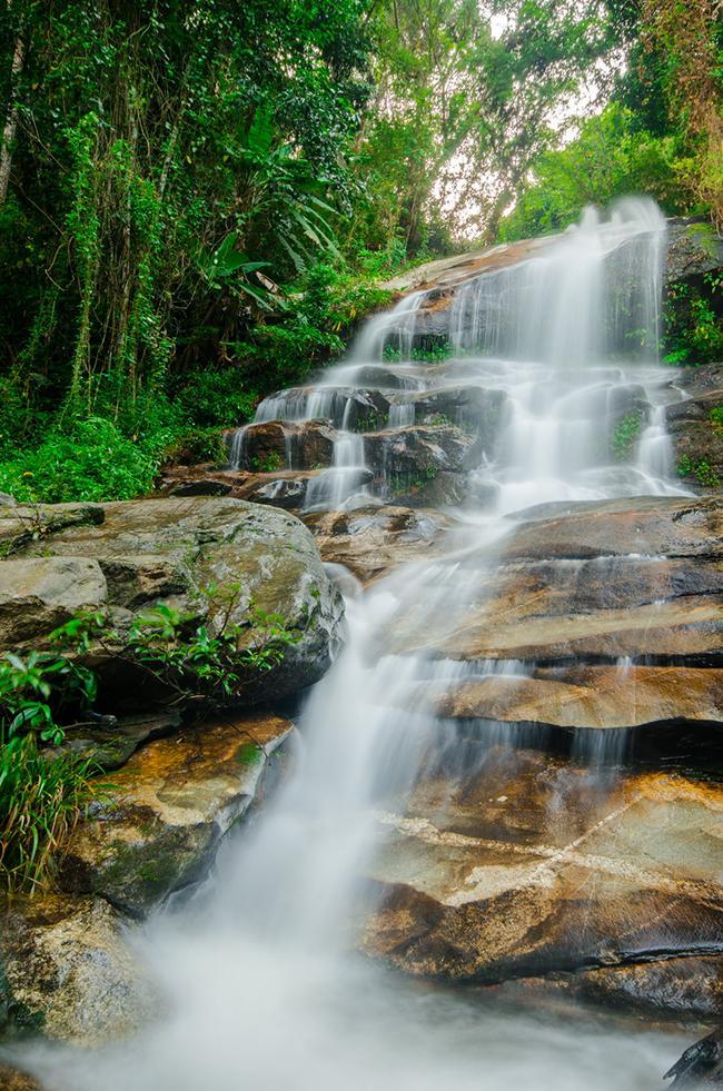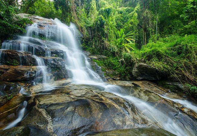 Montha Than Waterfall, formerly called “San Pa Yang Waterfall,” by the local people, features three tiers, flowing from the summit of Doi Pui. It runs through Khok Ma Creek until it reaches a 30-meter-high cliff and plunges into the basin below, spreading water droplets throughout the area. This stream further runs through Pha Ngoep, Wang Bua Ban, and Huai Kaeo Waterfall before flowing into the Ping River.